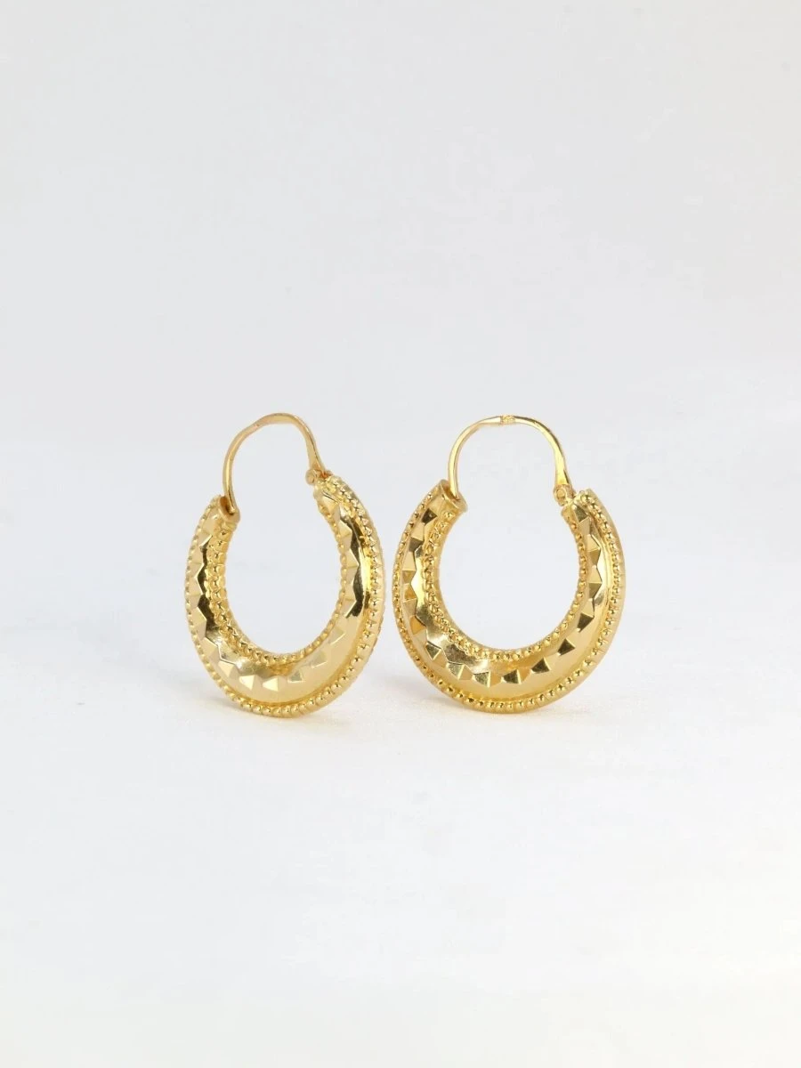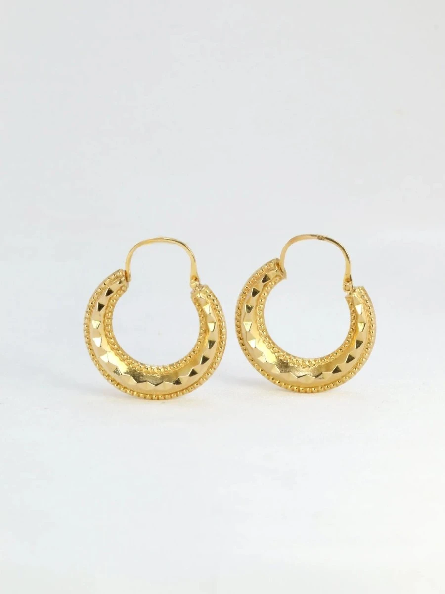 Paire de boucles d’oreilles créoles en or jaune 18k (750°/°°) délicatement décorées de motifs géométriques sur leurs parties centrales et godronnées sur leurs bords. Travail français vintage. Présence d’un poinçon tête d’aigle pour l’or 18 carats et d’un poinçon de fabricant.