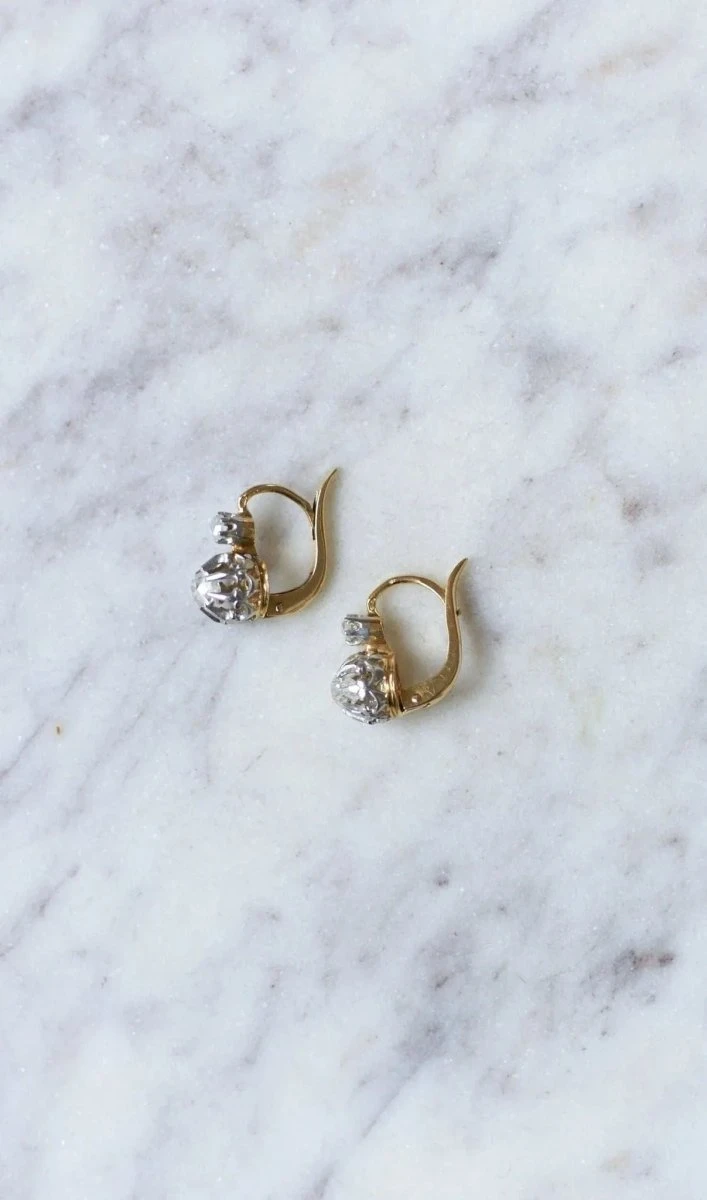 Boucles d’oreilles dormeuses en or jaune 18kt et platine (poinçon: tête d’aigle) ornées de diamants taillés à l’ancienne, pesant au total environ 0.50 Ct (couleur estimée H et K, pureté estimée SI), surplombées de diamants taillés en rose.