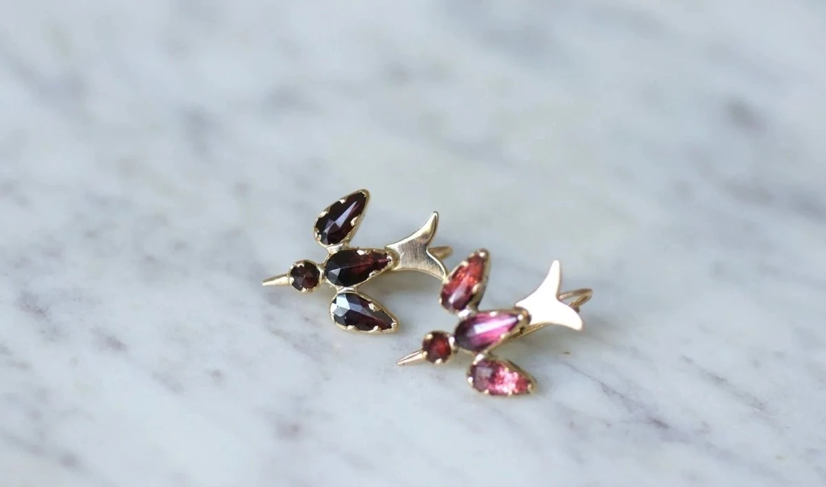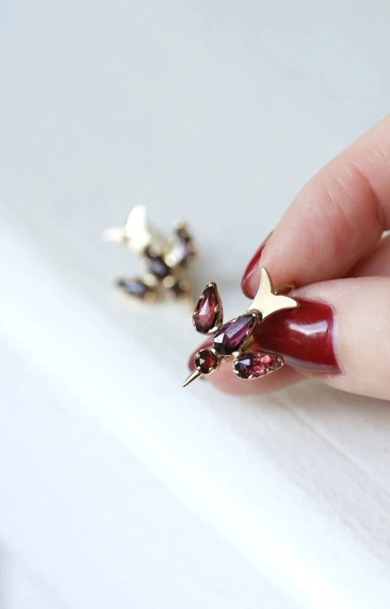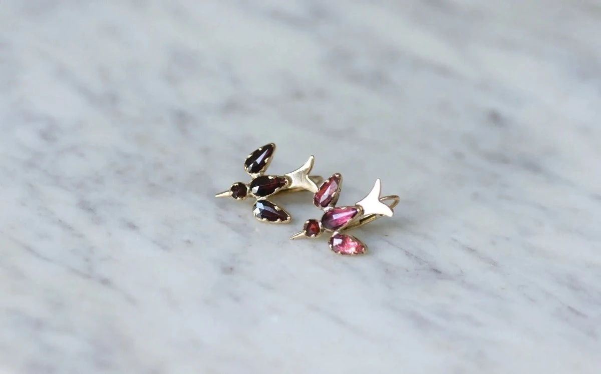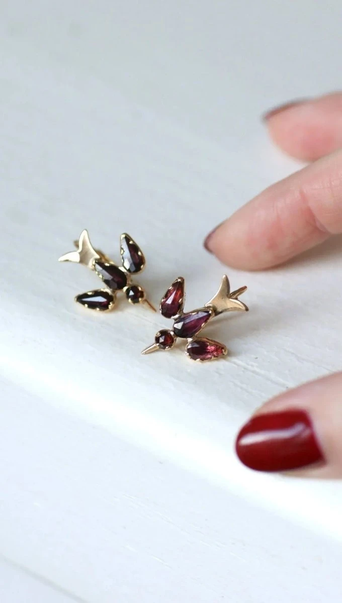 Boucles d’oreilles dormeuses, colombes en or rose 18kt (poinçon : tête d’aigle) serties de grenats de Perpignan montées sur paillon.