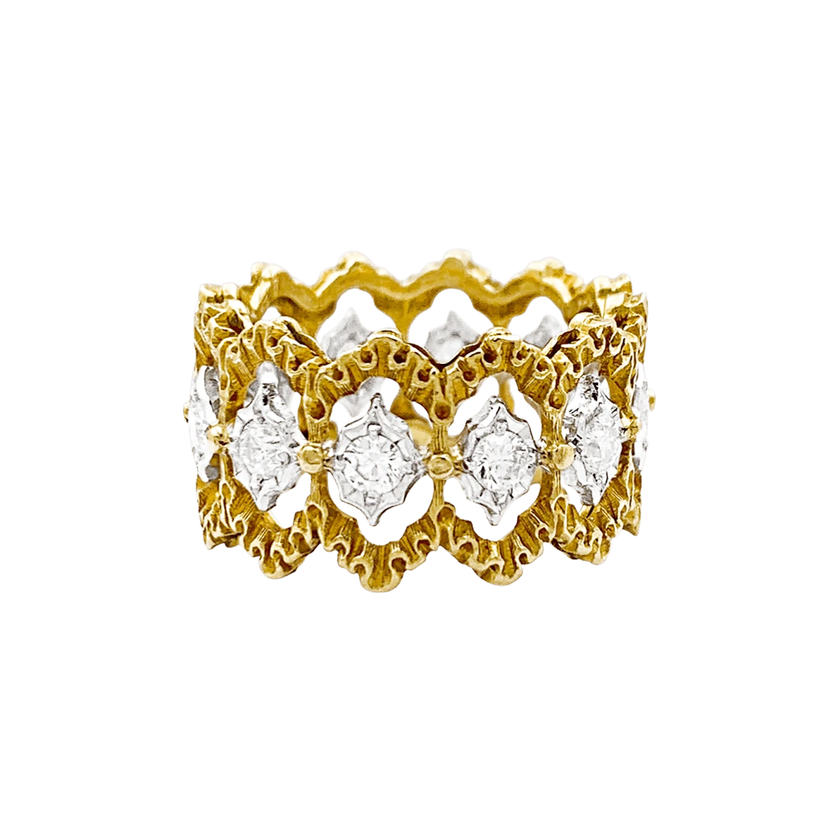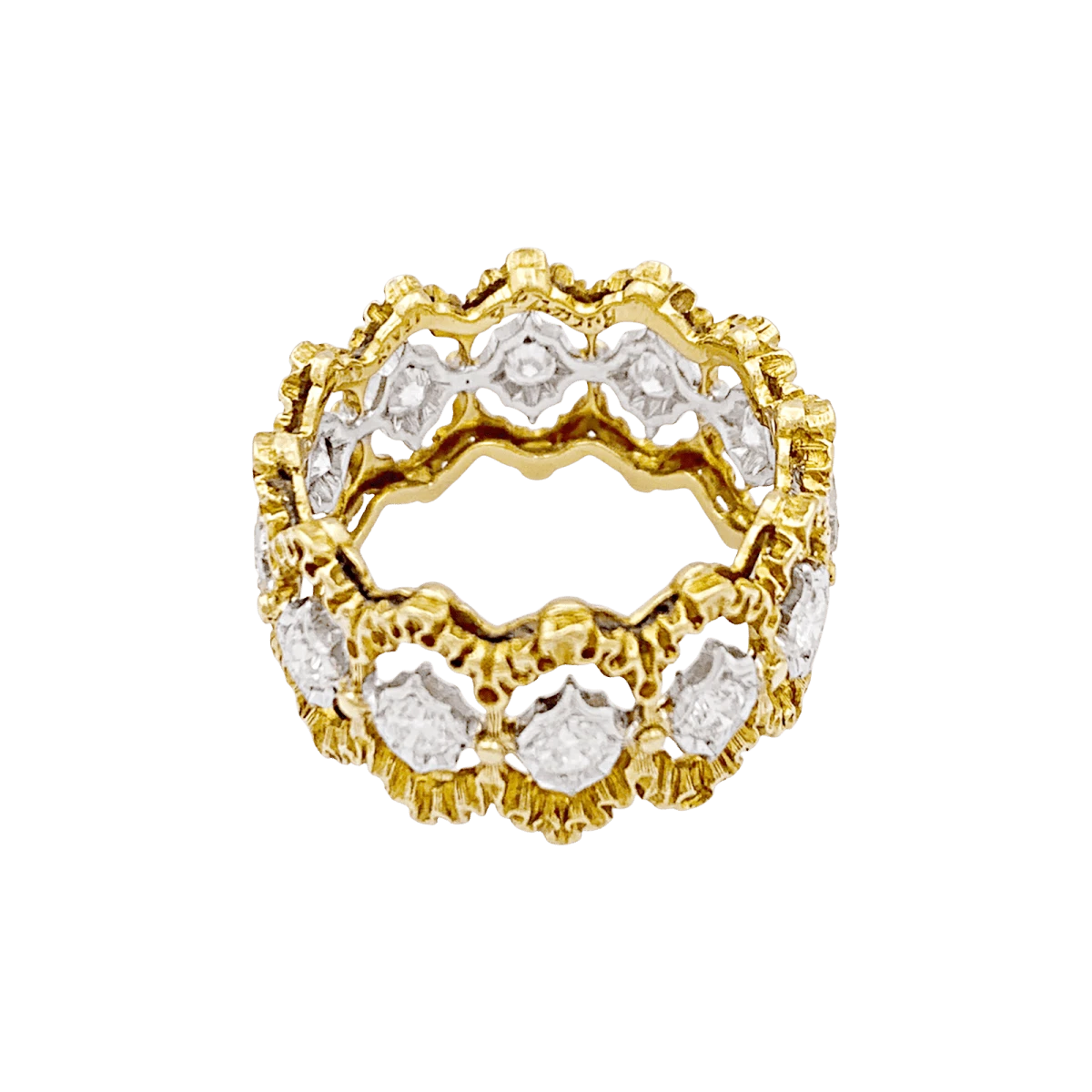 Bague Bandeau BUCCELLATI « Eternelle Band » en or jaune et or blanc 18 carats texturé sertie de 12 diamants taille brillant.