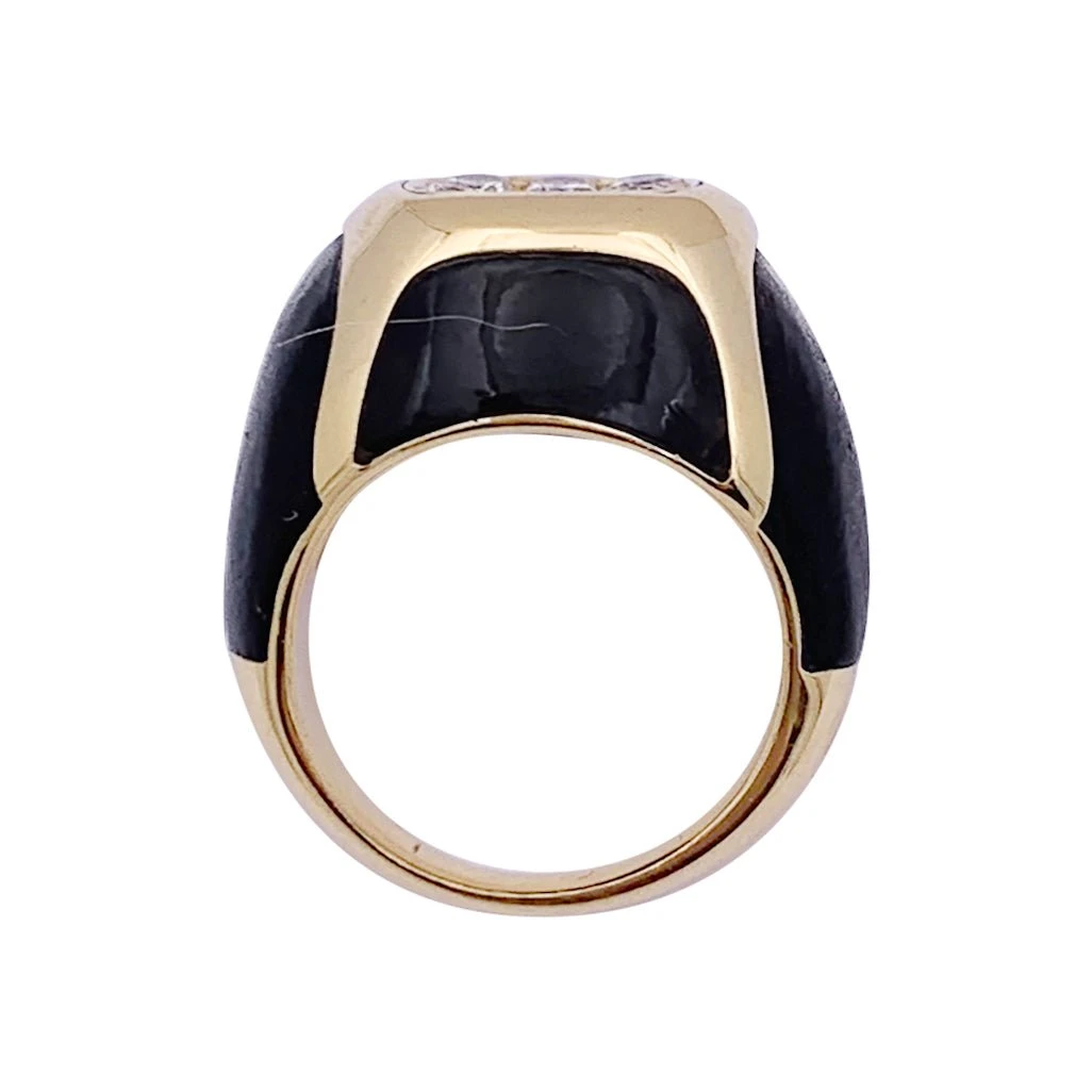 Une bague chevalière signée Boucheron Paris en or jaune 750/000 ornée de 4 coques en bois et sertie de neuf diamants taille brillant.