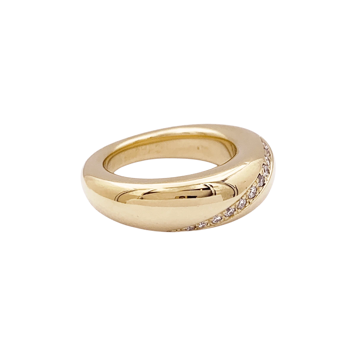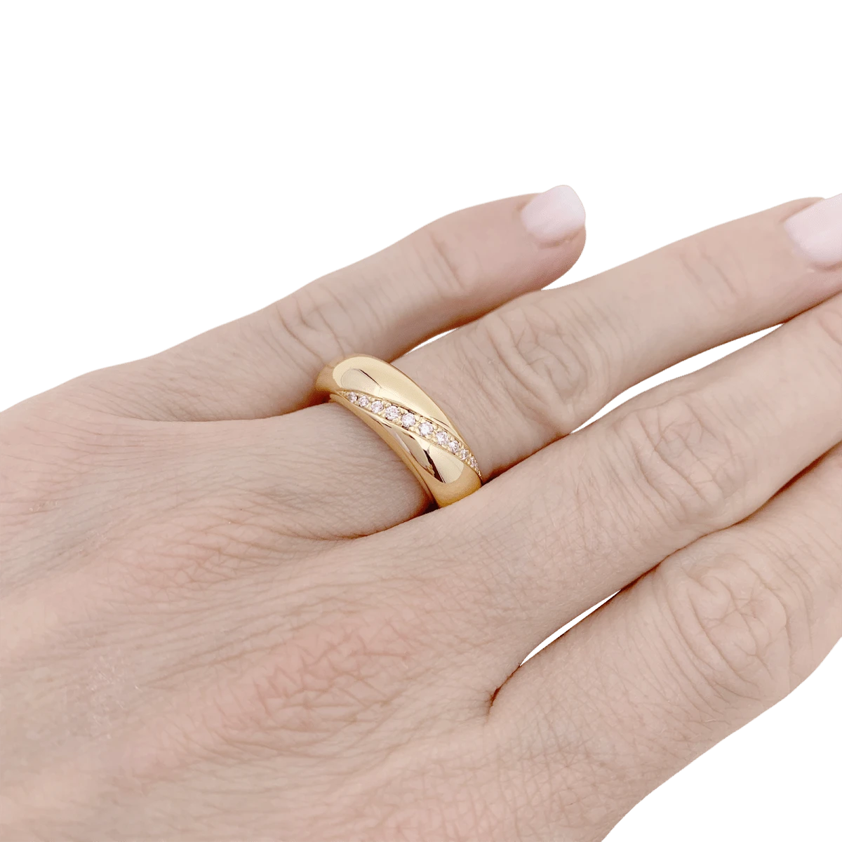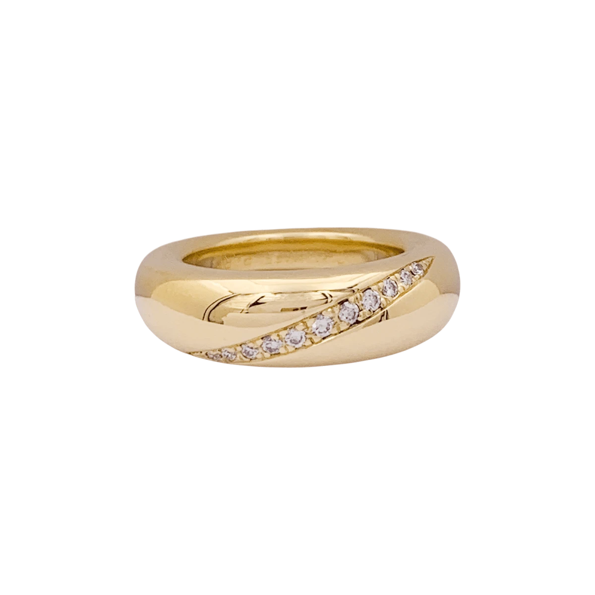 Une bague signée de la Maison Chaumet, collection “Anneau”, en or jaune 750/000 sertie d’une ligne de diamants taille brillant disposés en diagonale.
