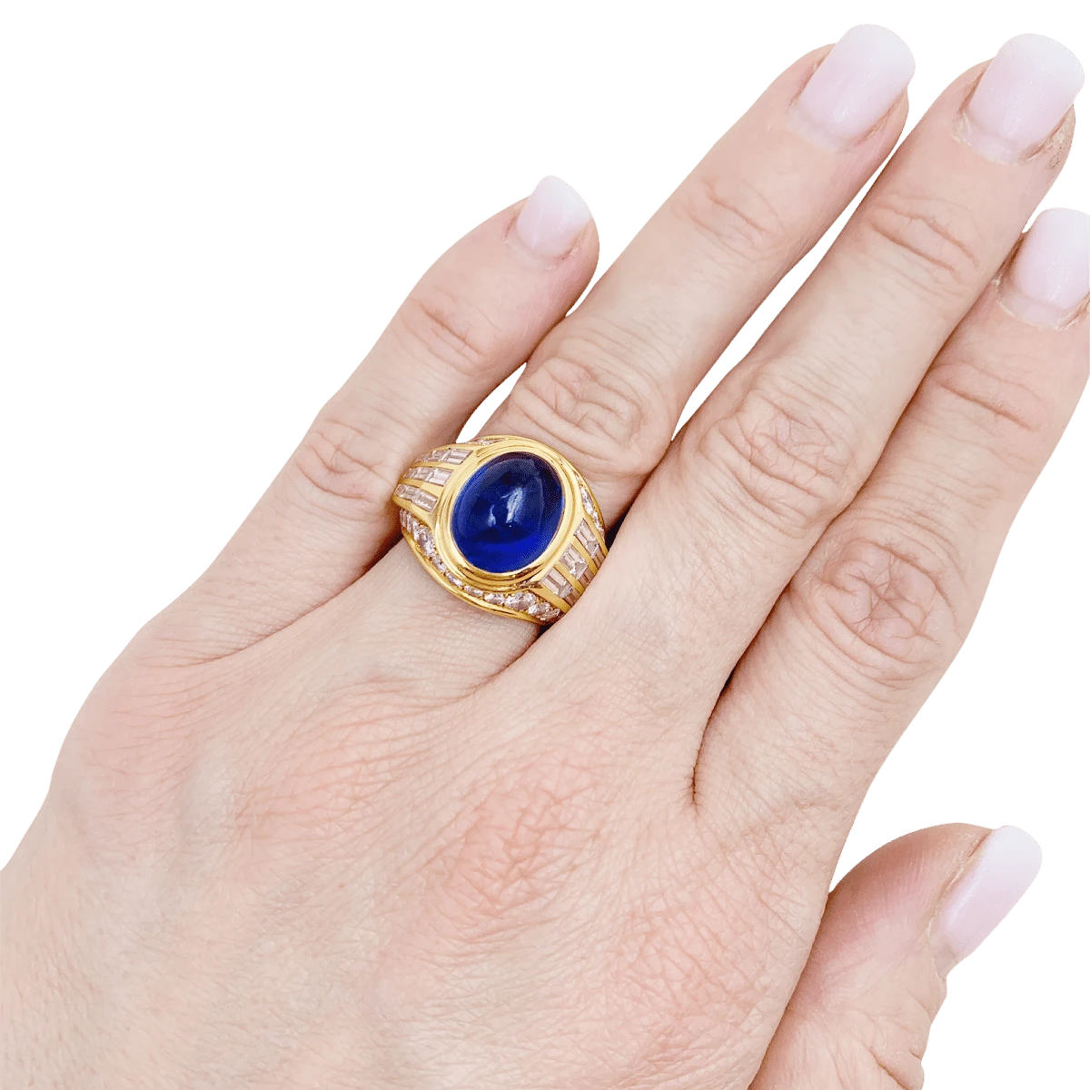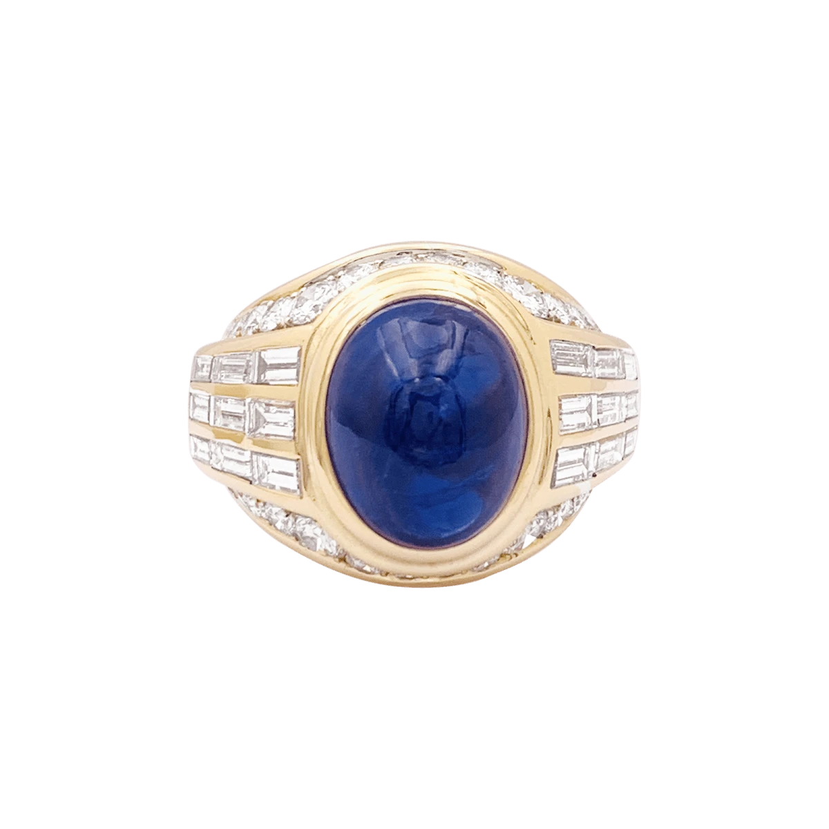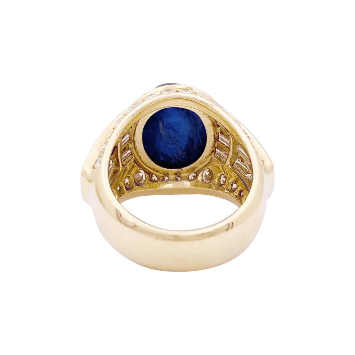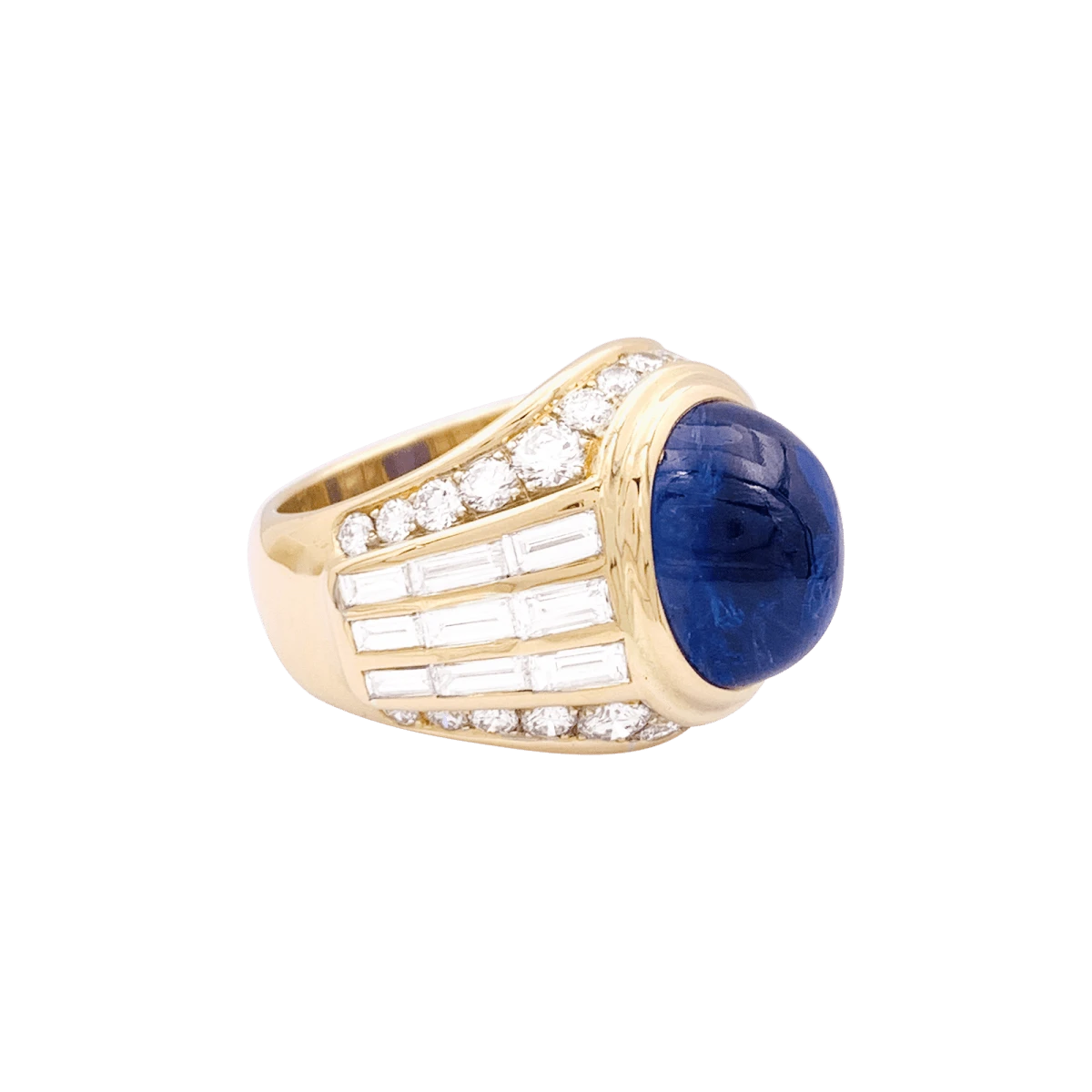 Bague Dôme en or jaune 18 carats pavée de diamants taille brillant et baguette, ornée d’un saphir cabochon de Ceylan non chauffé, certifié par Bellerophon.