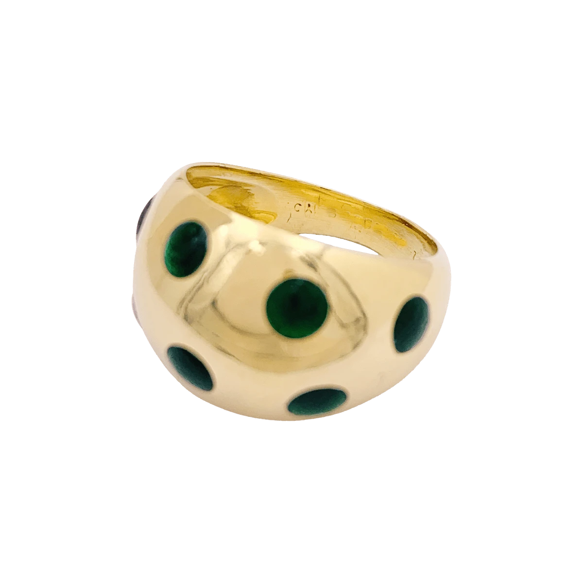 Bague Dôme VAN CLEEF & ARPELS en or jaune 18 carats ponctuée de motifs ronds en laque verte.