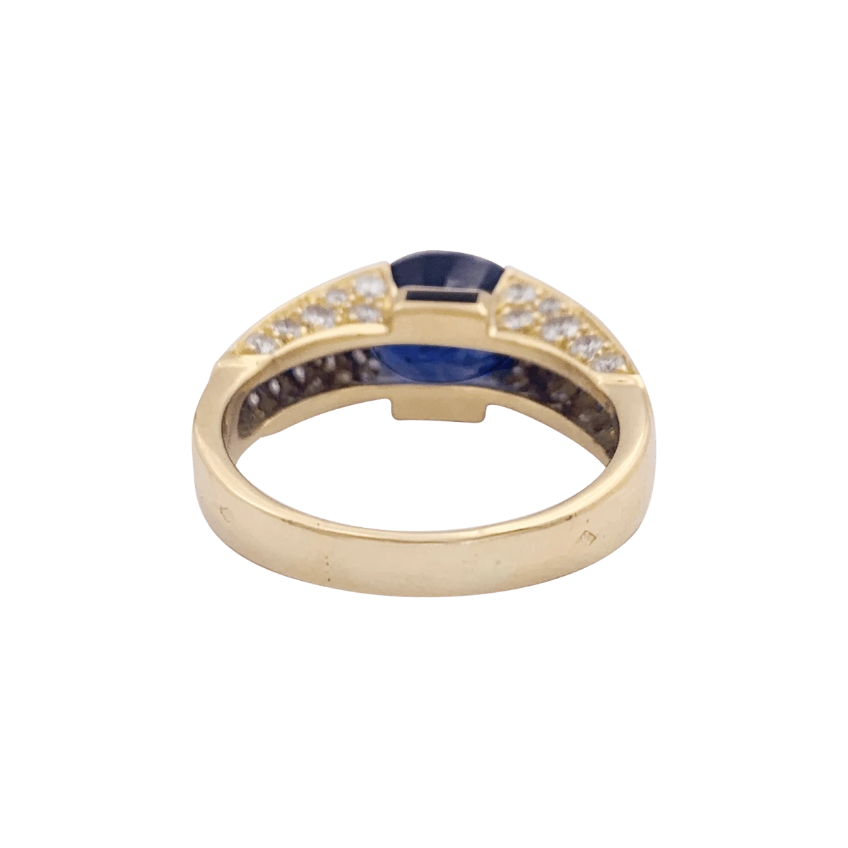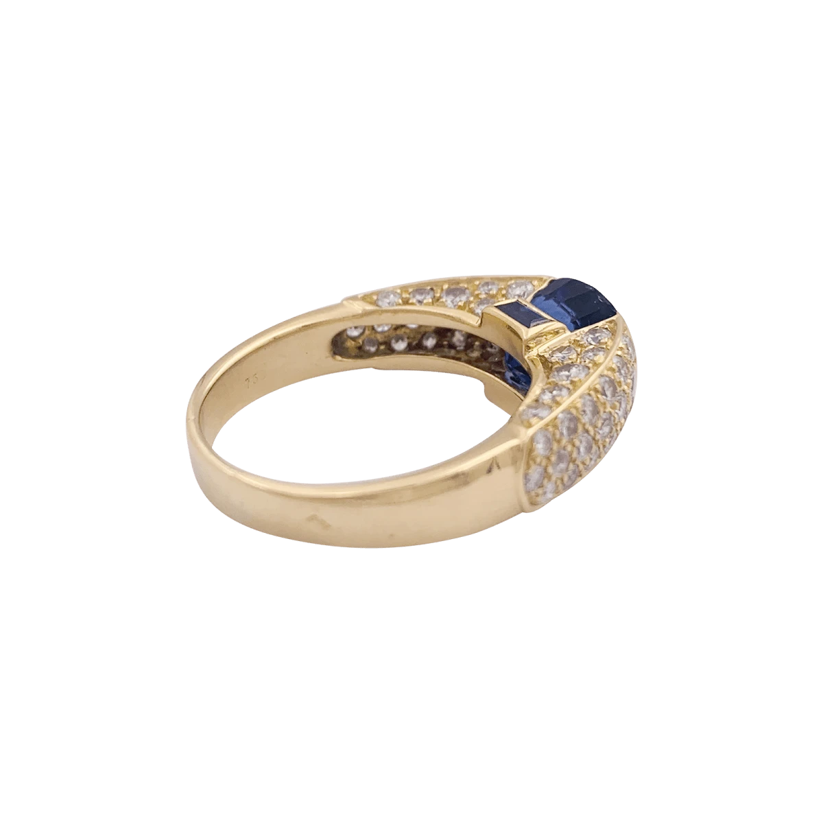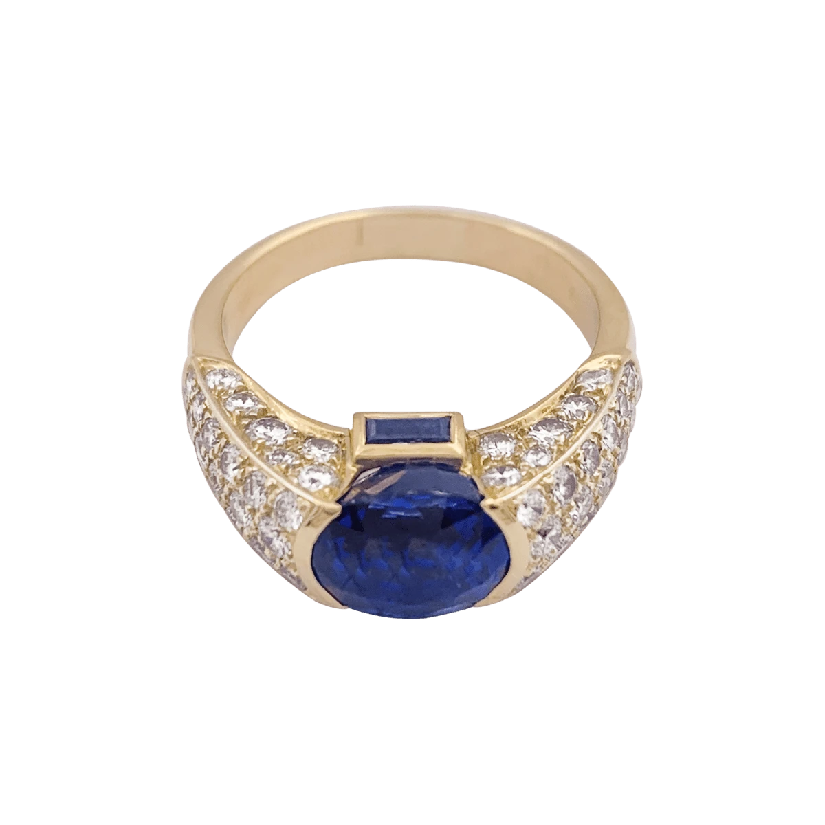 Une bague vintage signée de la Maison O.J. Perrin en or jaune 18 carats sertie d’un saphir oval facetté de 3,76 carats épaulé de deux saphirs taille baguette dans un entourage de diamants taille brillant.
