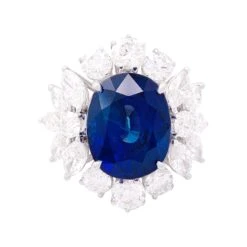 Bague en or blanc 18 carats sertie d’un saphir ovale facetté dans un entourage de diamants ronds et navettes. Certificat Bellerophon : Madagascar, chauffé.