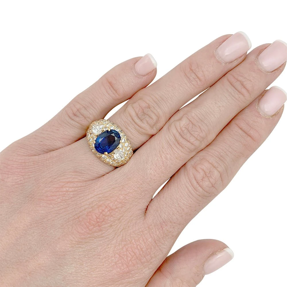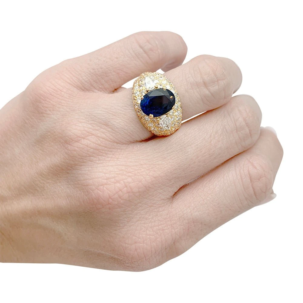 Une bague jonc en or jaune 750/000 sertie d’un saphir ovale de 3,28 carats épaulé de deux diamants taille poire d’environ 0,40 carat chacun dans un pavage de diamants taille brillant d’un poids total de 0,80 ct environ.