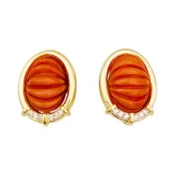 Une paire de boucles d’oreilles en or jaune 750/000, chacune ornée de corail orange sculpté et rehaussée de diamants taille brillant.
