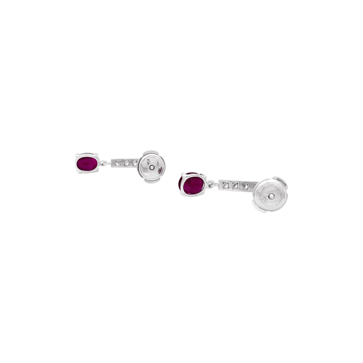 Une paire de Boucles d’oreilles en or blanc 18 carats. La barrette est sertie de diamants taille brillant. Elle retient en pendentif un rubis ovale serti dans un chaton mobile à quatre griffes. Poids des rubis : 1,024 carat et 1,038 carat. Certificat Bellerophon : Origine Birman, Chauffé. Sytème Alpa pour oreilles percées. Hauteur : 20 mm. Référence : 34398.