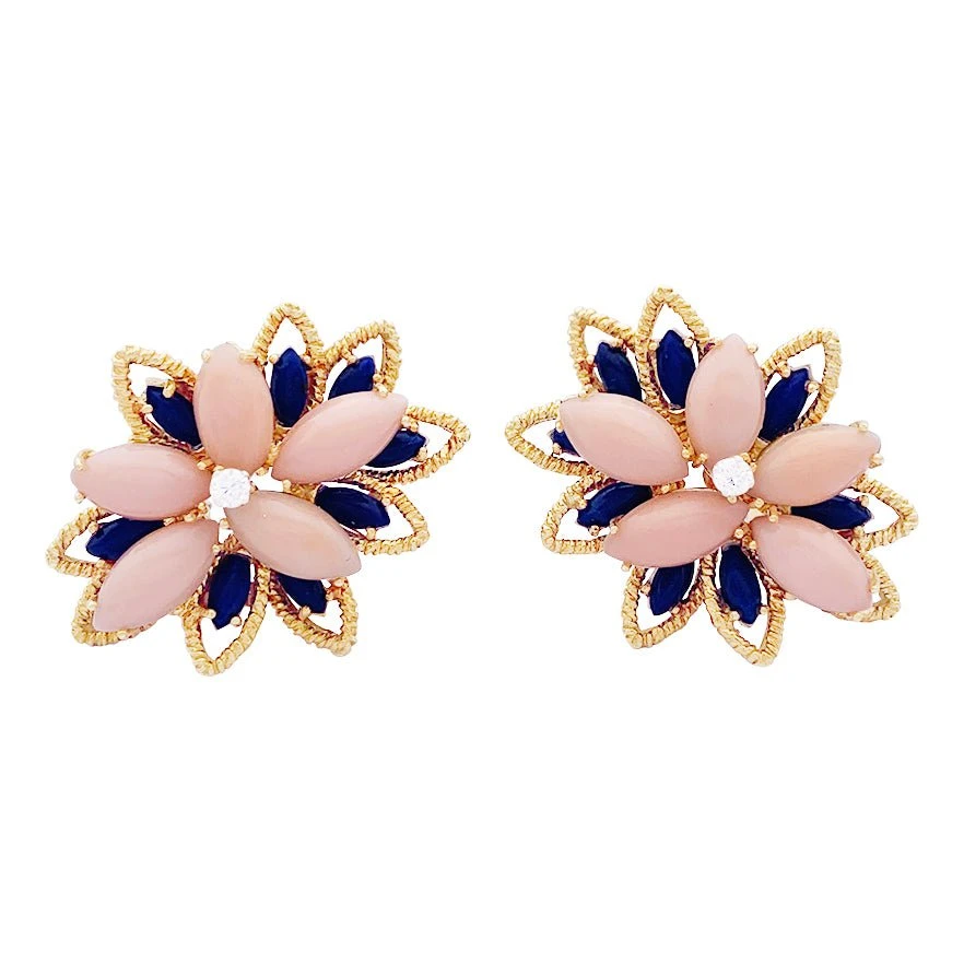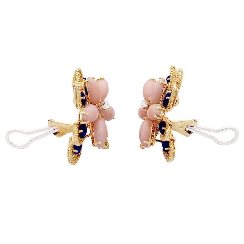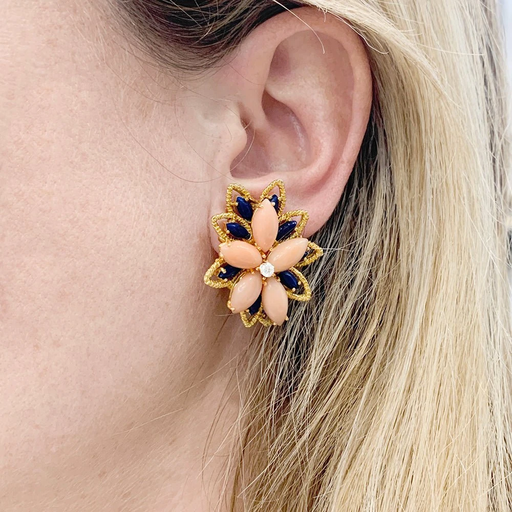Boucles d’oreille en or jaune 18 carats guilloché figurant un motif floral stylisé, sertie de cabochons de lapis lazuli et de corail peau d’ange et d’un diamant au centre.