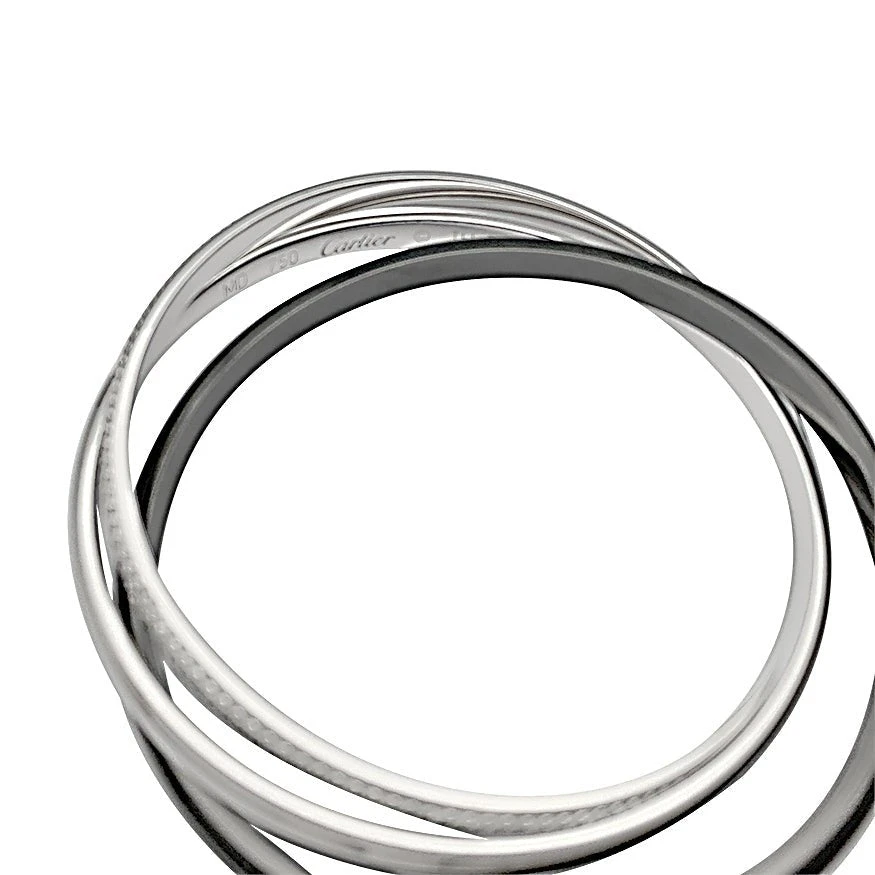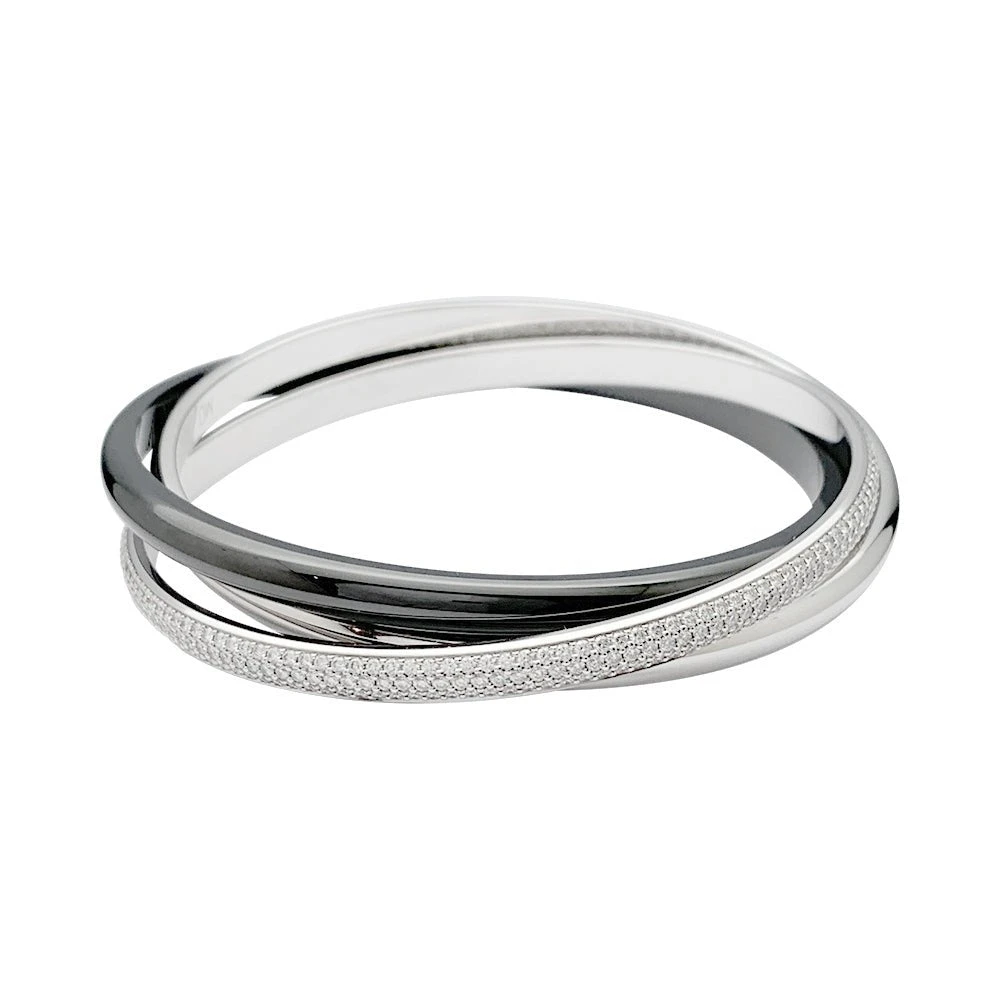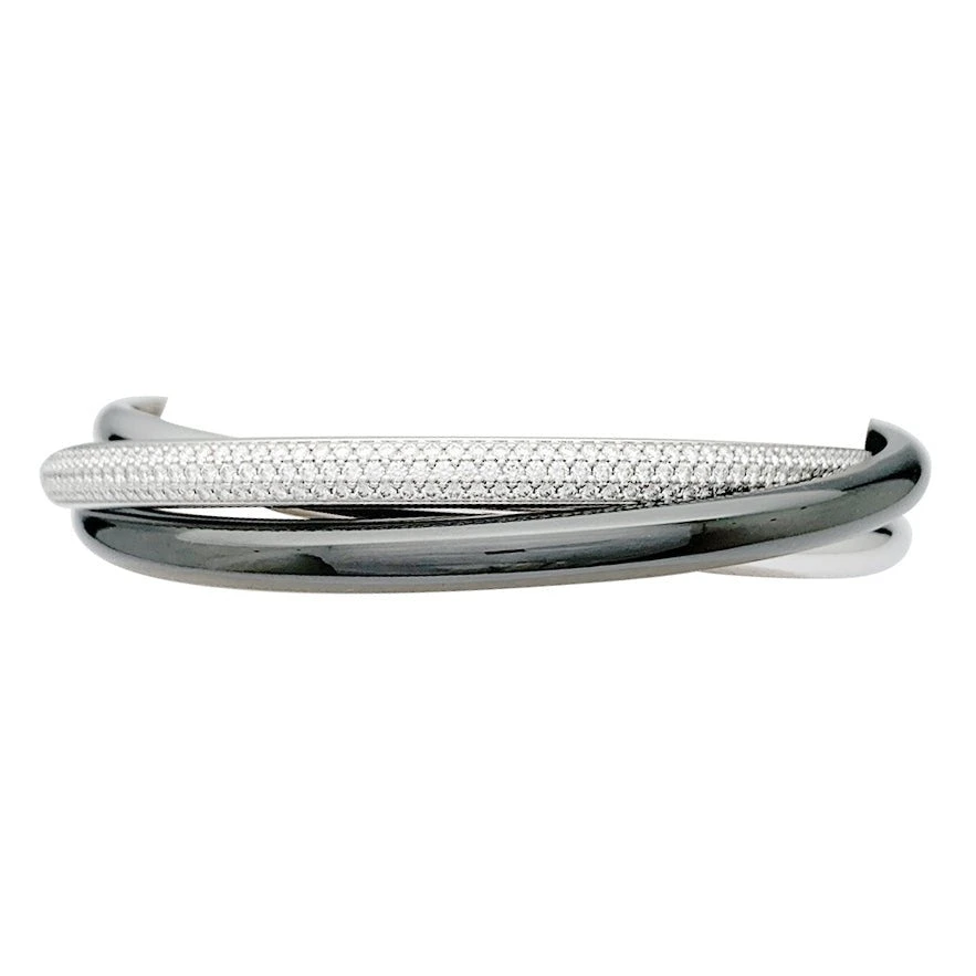 Un bracelet signé de la Maison Cartier, collection “Trinity”, composé d’un jonc en or blanc 750/000, un jonc en céramique noire et un jonc en or blanc 750/000 pavé de diamants taille brillant.