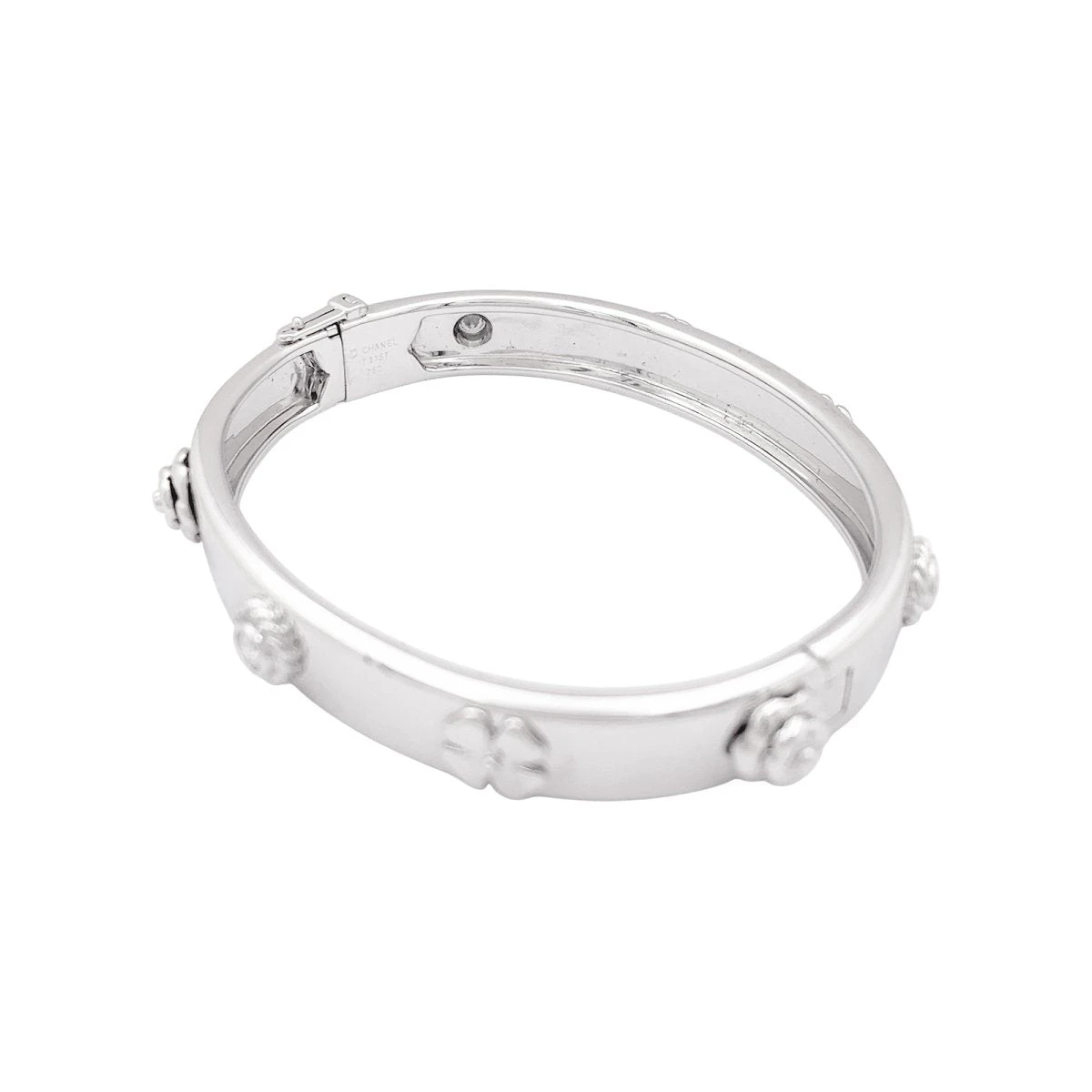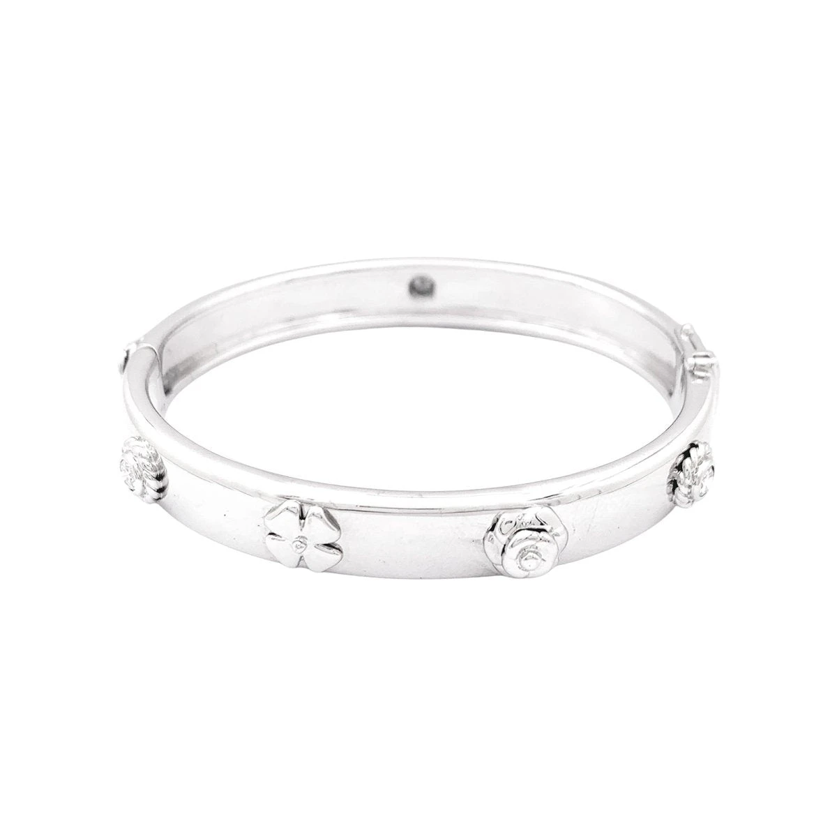 Bracelet signé de la Maison Chanel, collection ‘Trois Symboles’, composé d’un jonc ponctué d’une frise de trois motifs se répétant : un trèfle à quatre feuilles, un camélia et une rosace sertie d’un diamant taille brillant.