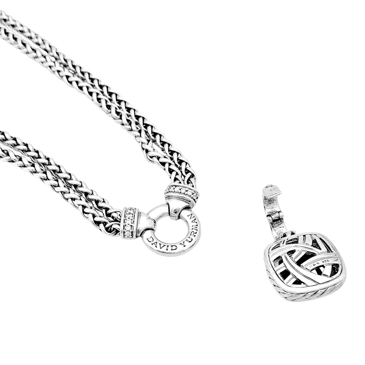 Collier Pendentif DAVID YURMAN modèle « Grand Albion » en argent, composé d’une double chaîne maille épi de blé dont les extrémités serties de diamants taille brillant retiennent un motif circulaire permettant d’y suspendre le pendentif « Grand Albion » en argent serti d’une hématite facettée et de diamants taille brillant.