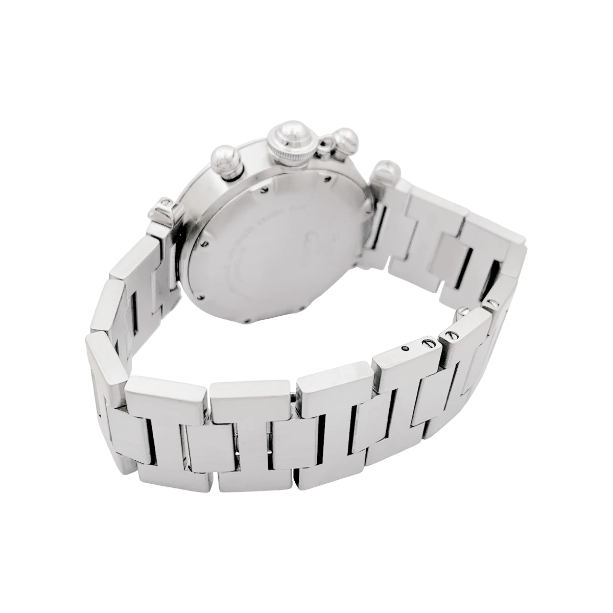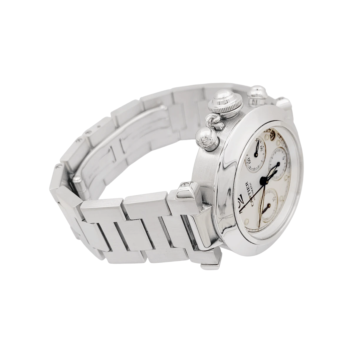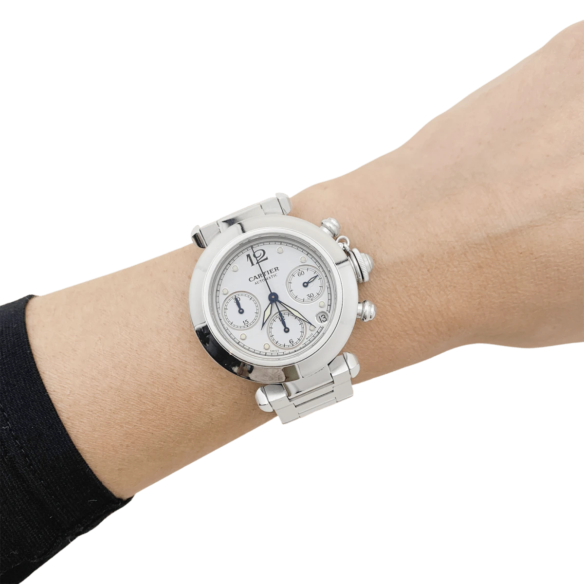 Une montre signée de la Maison Cartier, modèle “Pasha”, en acier sur un bracelet en acier avec double boucle déployante. Cadran blanc, date entre 4 et 5 heures, guichet petite seconde, fonction chronographe.
