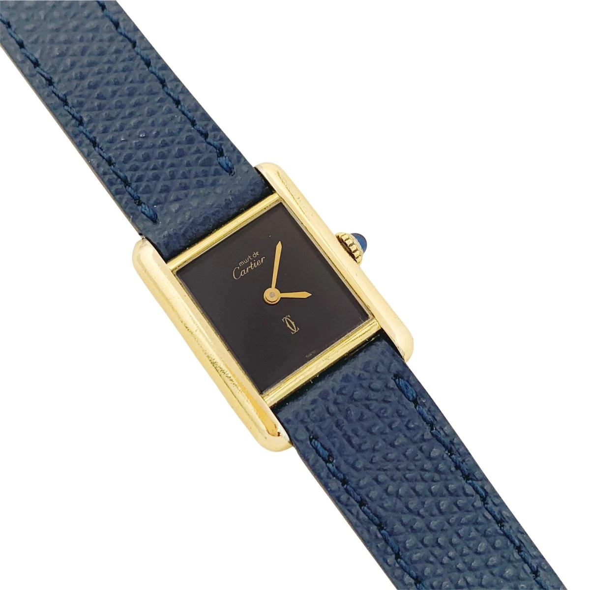 Une montre signée de la Maison Cartier, modèle “Tank Must”, en argent 925/000 plaqué or sur un bracelet en cuir avec une boucle ardillon en métal doré. Cadran laqué en noir. La ligne de montres ‘Tank Must’ de Cartier est lancée en 1977 et devient la première collection de montre en argent plaqué or à mouvement mécanique vendue à prix abordable. Acclamée par tous, montre fétiche de Yves Saint Laurent elle est aujourd’hui la montre la plus vendue de Cartier dans plus de 125 pays.