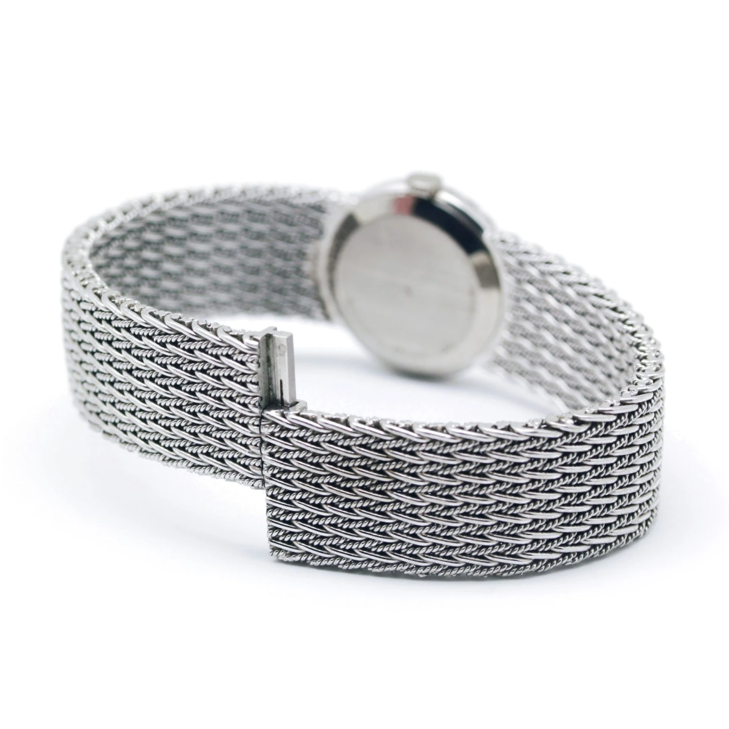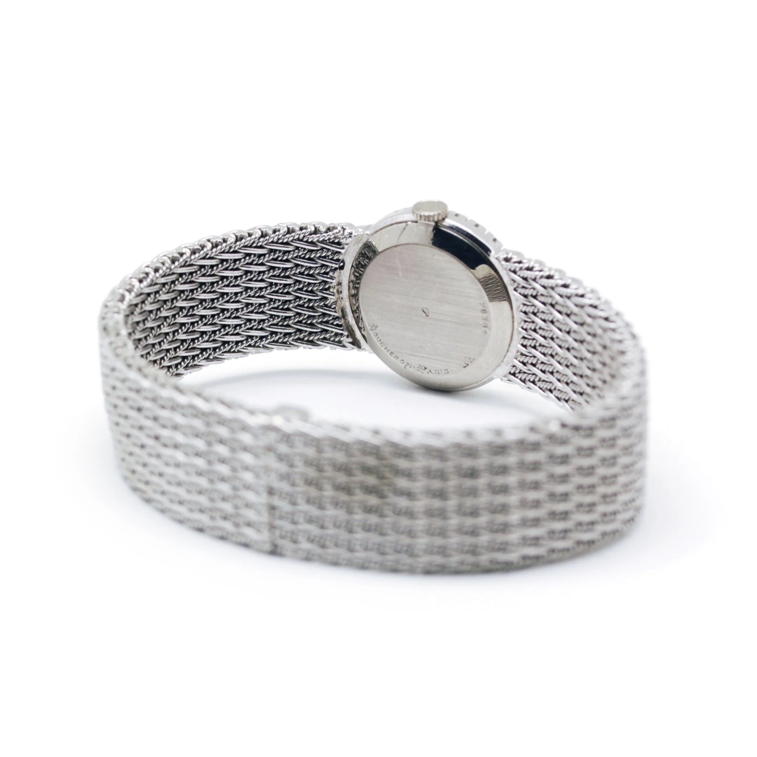 Montre bracelet en or blanc 750‰ signée Boucheron Paris datant des années 70, le cadran est entouré de 27 diamants (0,50 carat environ).