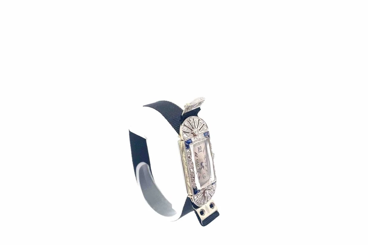 Montre mécanique en or blanc 18 carats, platine, diamants et saphirs calibrés. Le verre de la montre est en cristal.
