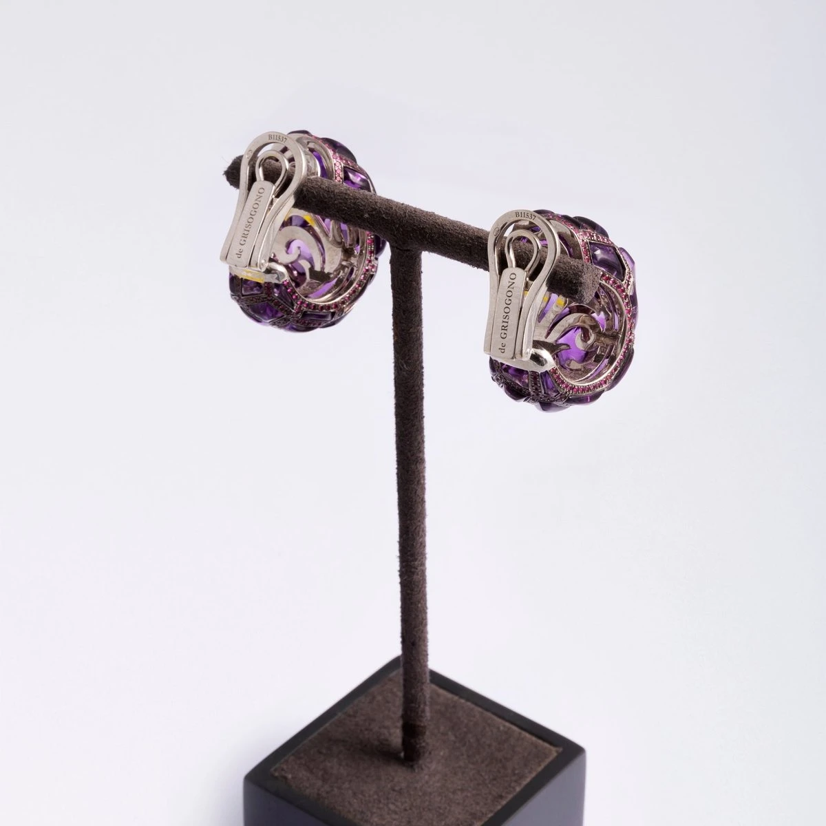 Paire de Boucles d’oreilles Clip signées DE GRISOGONO en or blanc 18 carats et améthystes
