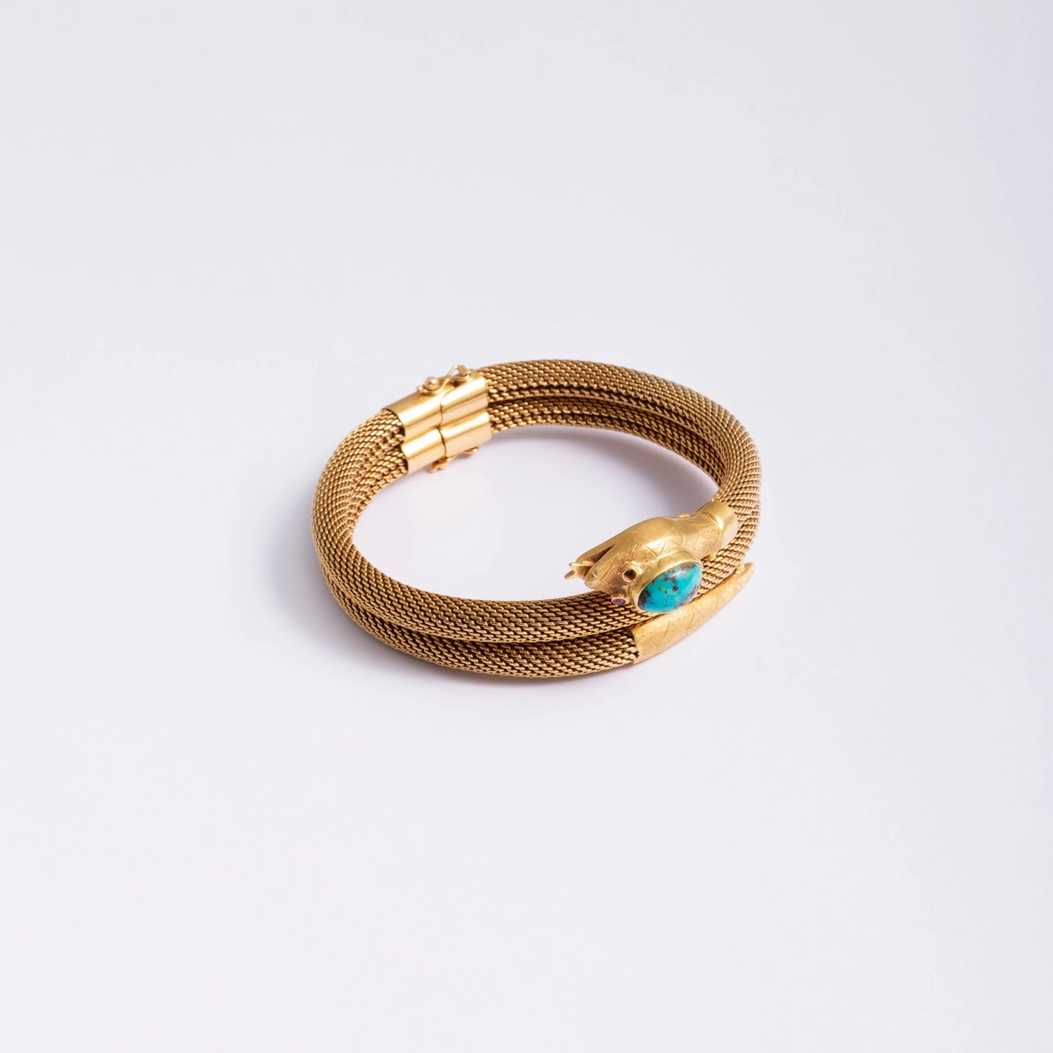 Bracelet double tubogas en or jaune 18 carats formant un serpent avec la tête ornée d’un cabochon de turquoise et les yeux sertis de rubis.