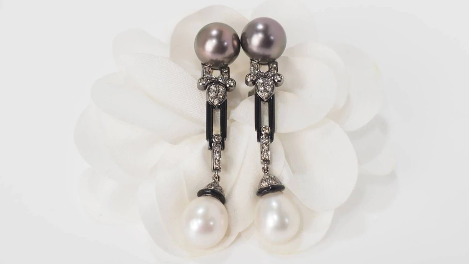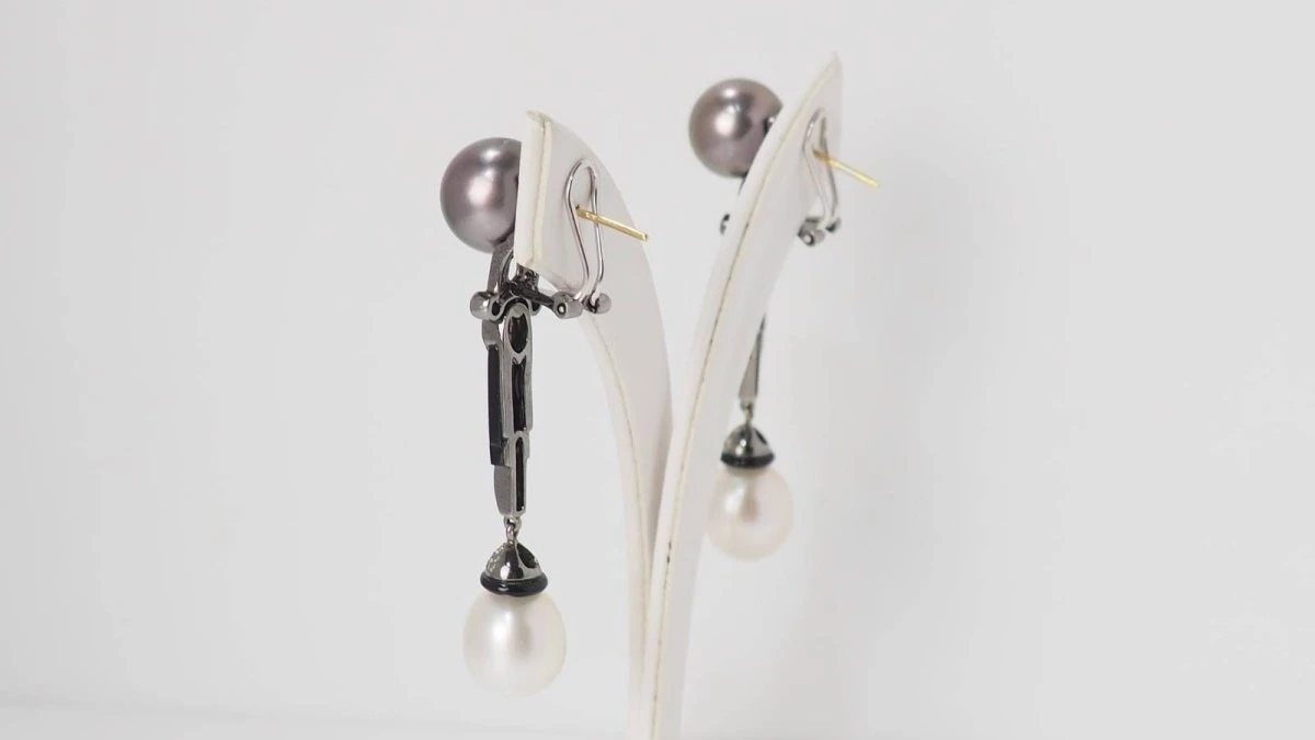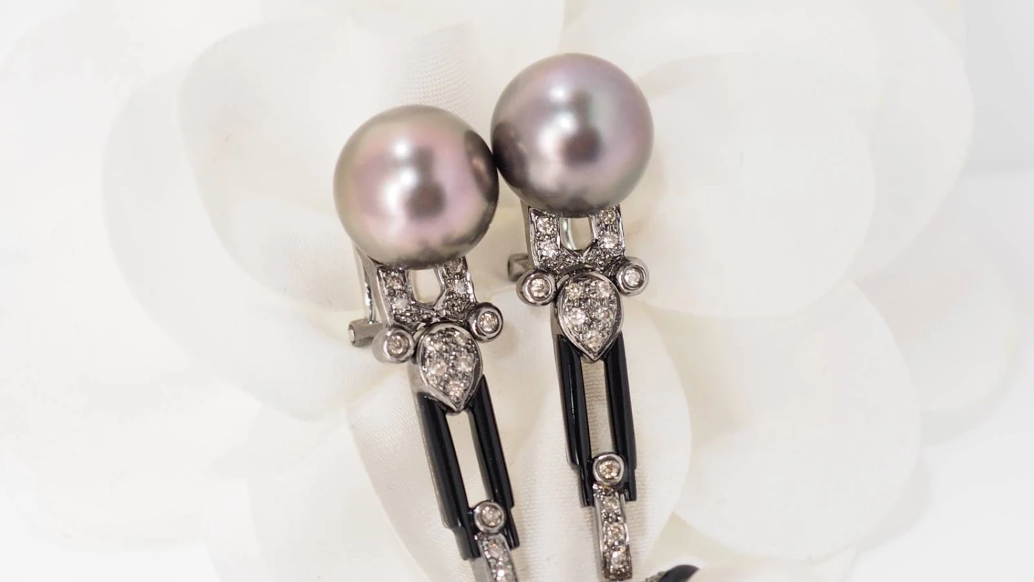 - Perle de Tahiti (⌀ 12 mm) de couleur grise aubergine et perle d’Akoya blanches (ø11,5 mm) ;