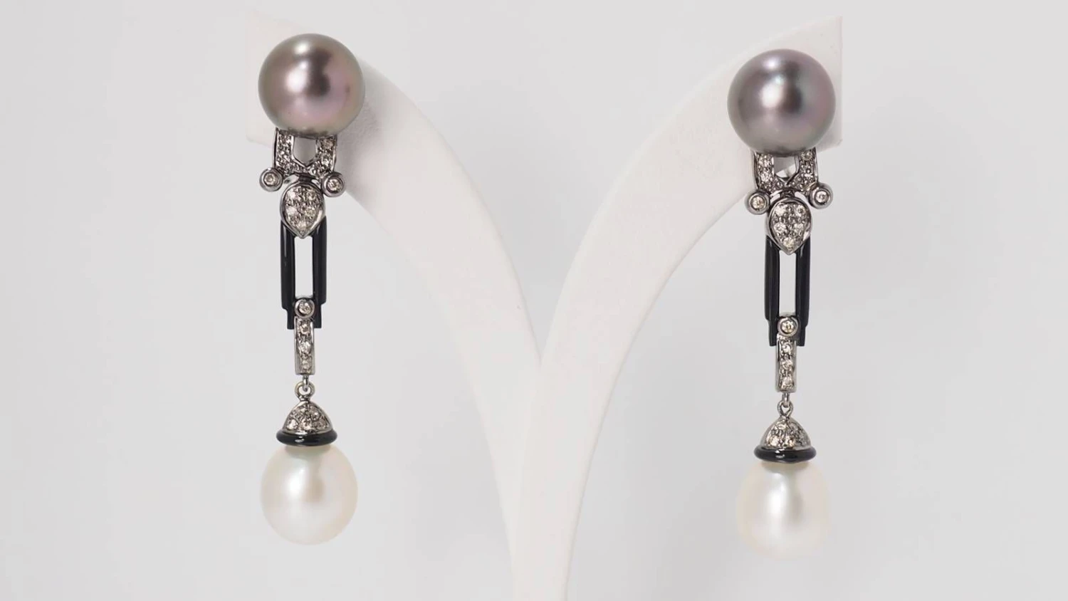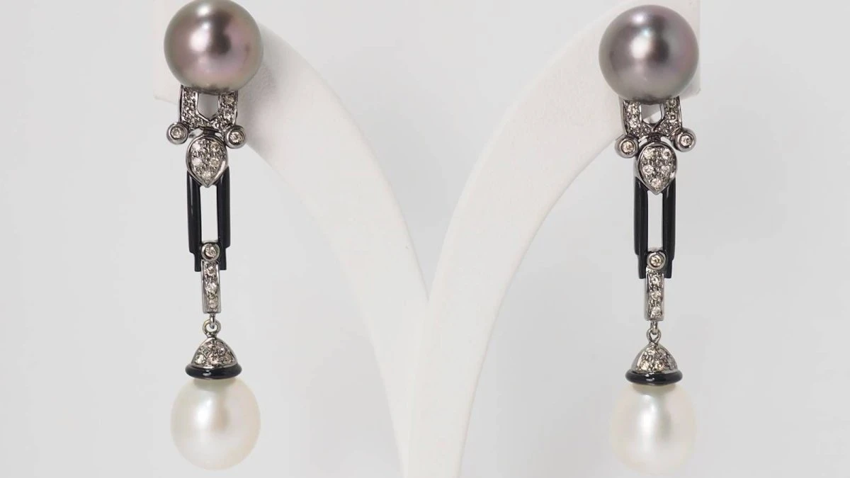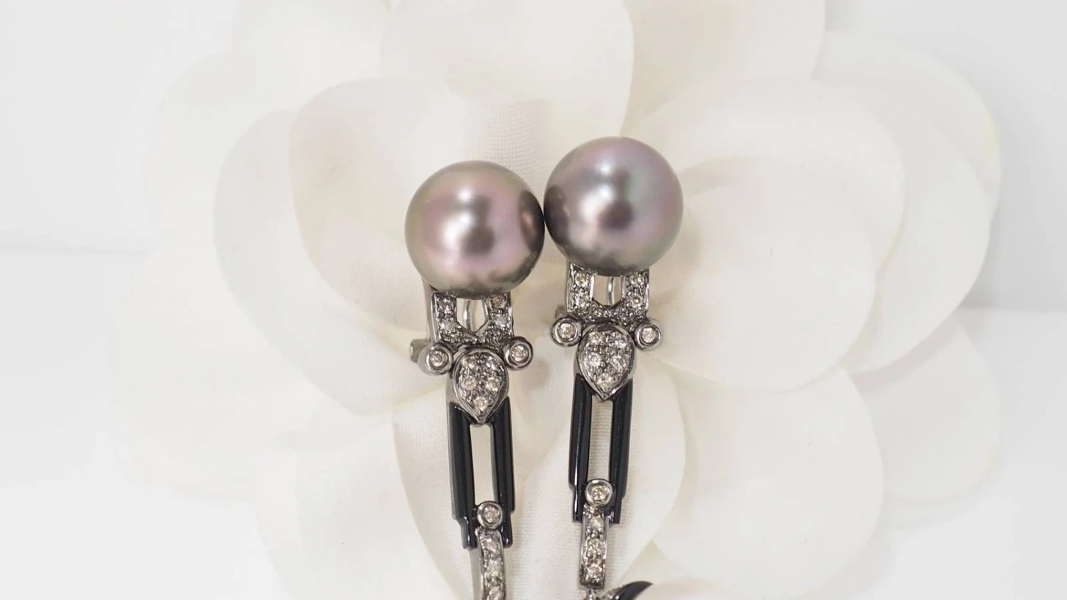 - Perle de Tahiti (⌀ 12 mm) de couleur grise aubergine et perle d’Akoya blanches (ø11,5 mm) ;