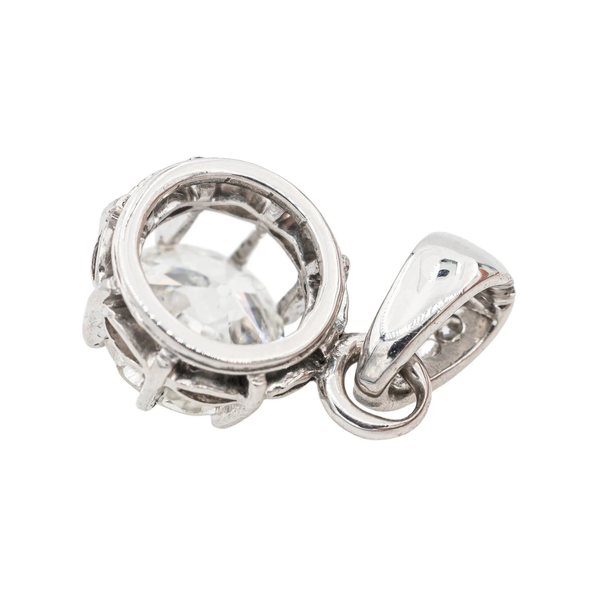 Pendentif serti de diamants. en or blanc 750 millièmes (18 carats). un diamant central taille ancienne. d’un poids d’environ 1.37 cts. 2 diamants taille ancienne. d’un poids total d’environ 0.038 ct. (chaque diamant d’un poids d’environ 0.03 et 0.008 ct). poids total des diamants : 1.41 cts. dimensions avec la bélière : 1.94 cm x 0.97 cm. poids total: 2.01 g. excellent état