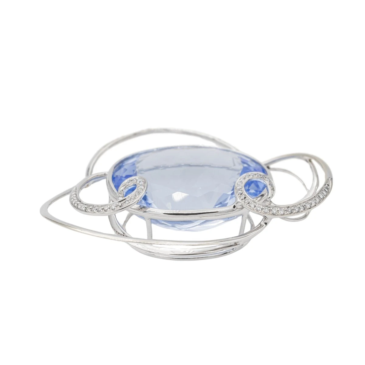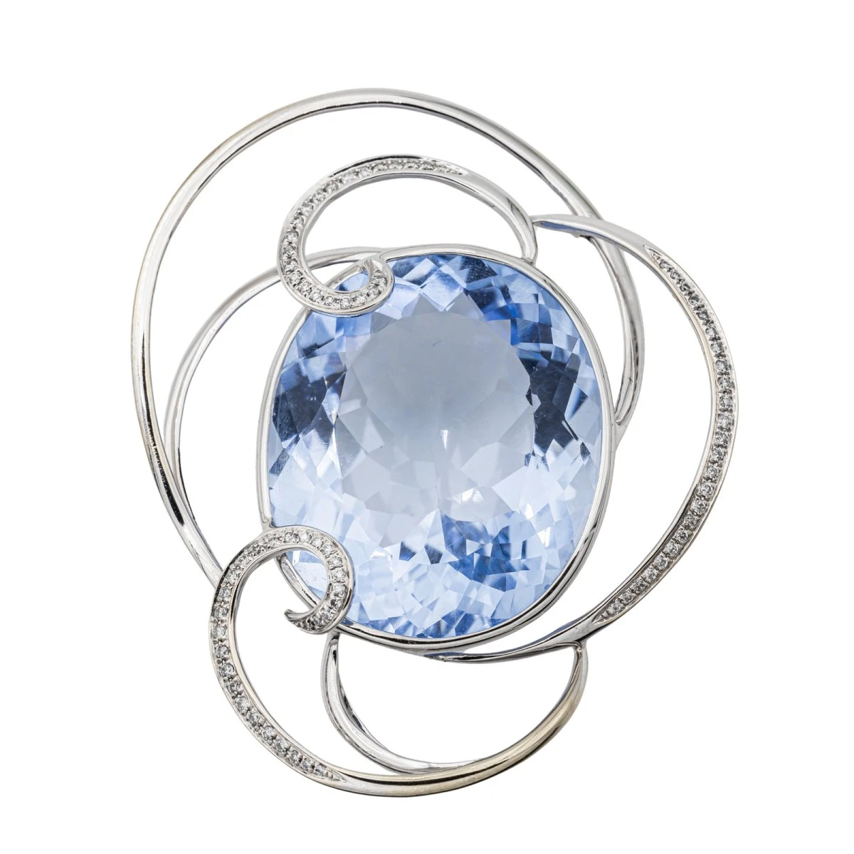 Pendentif serti d’une aigue marine et de diamants. en or blanc 750 millièmes (18 carats). 1 aigue marine taille ovale. d’un poids total d’environ 36.67 cts. entourée de 74 diamants taille brillant. d’un poids total d’environ 0.37 ct. (chaque diamant d’un poids d’environ 0.005 ct). dimensions: 3.82 cm x 4.64 cm. poids total: 12.54 g. poinçon hibou. excellent état