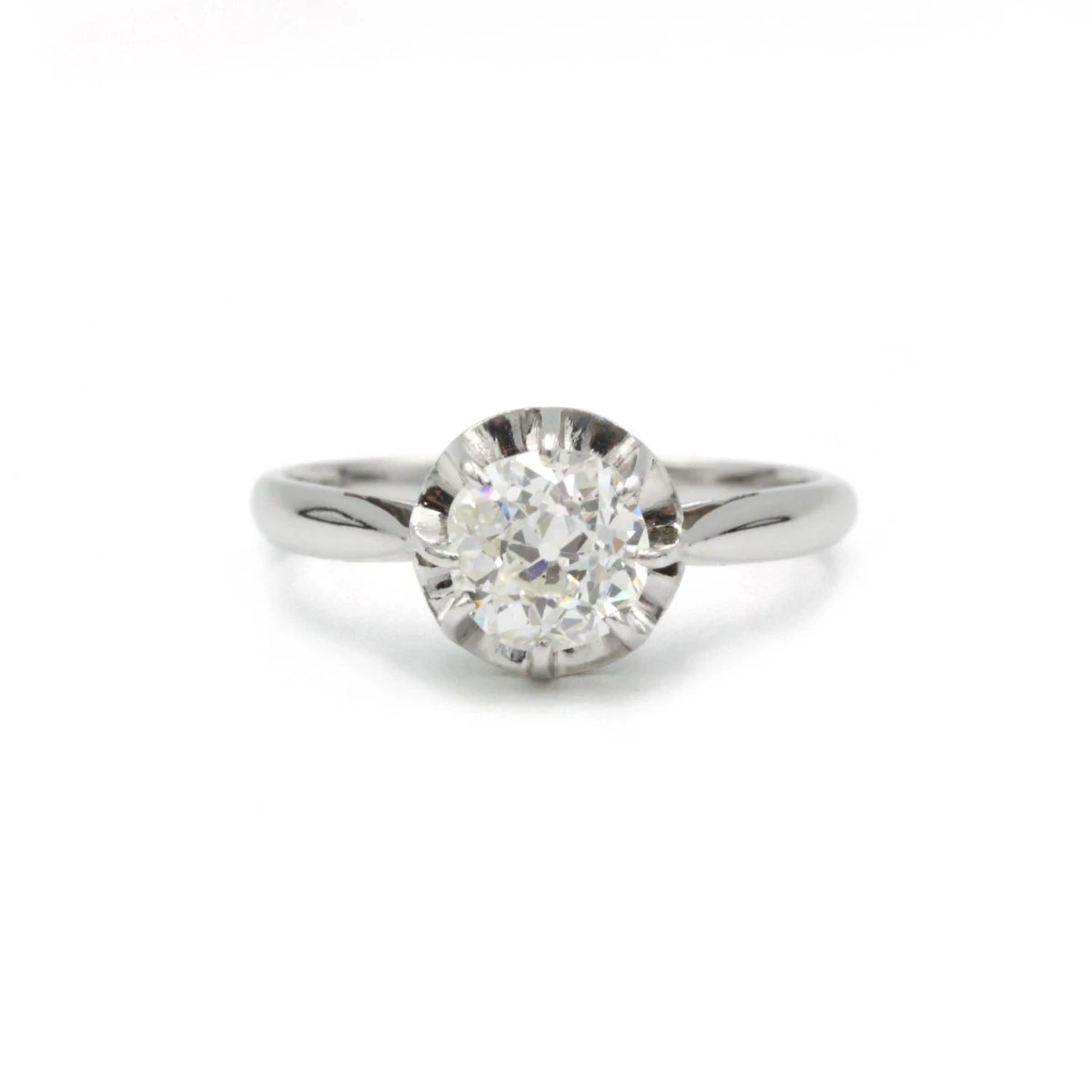 Solitaire ancien en or blanc 750‰, serti d’un diamant taille ancienne d’environ 0,90 carat, qualité H-SI.